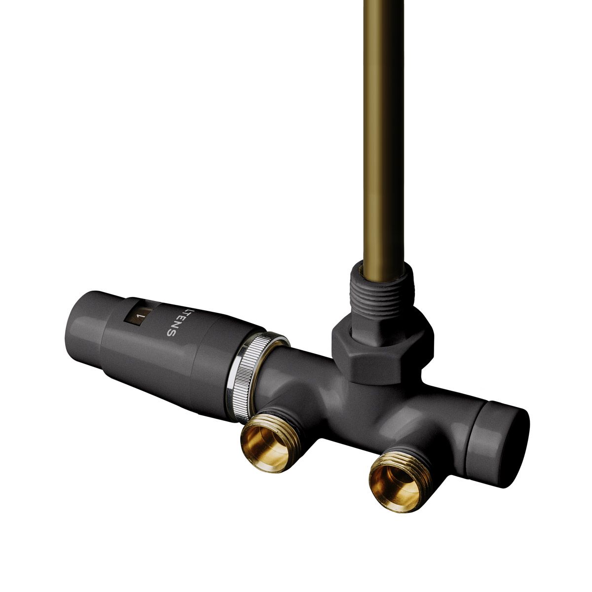 Das Einloch-Anschlussset besteht aus einem Kombiventil mit Thermostatventil und Absperrventil, einem Thermostatkopf der Marke Oltens, der am Ventilkörper befestigt ist, und einem 30 cm langen Verteilerrohr.