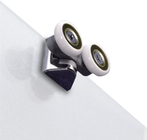 Tür mit festem Teil, Schiebetür. Einstiegsbreite 55,6 cm bei maximaler Öffnung. Untere Rollen abnehmbar.