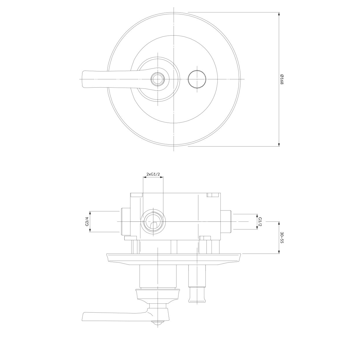 - zwei Eingänge (für Warm- und Kaltwasser): 1/2", ein Mischwasserausgang: 1/2"