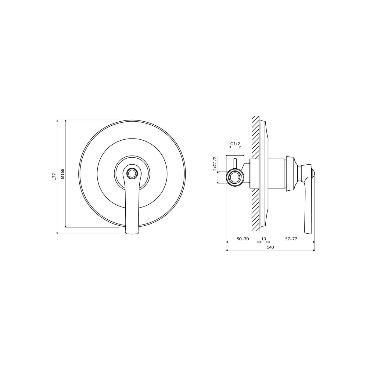 - zwei Eingänge (für Warm- und Kaltwasser): 1/2", ein Ausgang für Mischwasser: 1/2"