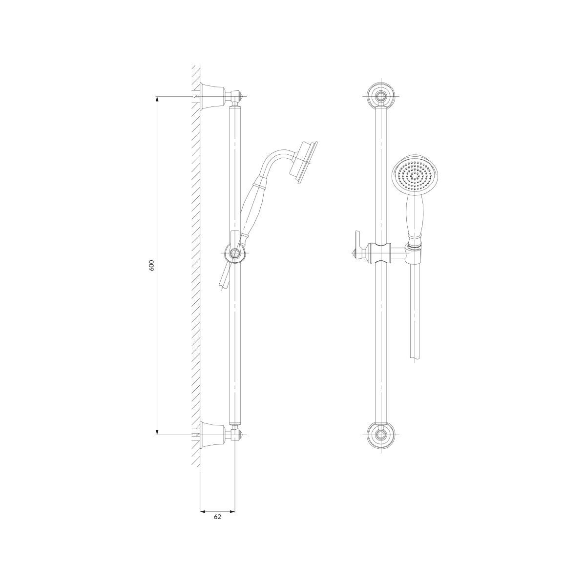 - Duschstange aus Messing, Länge: 64 cm, Befestigungsabstand: 60 cm