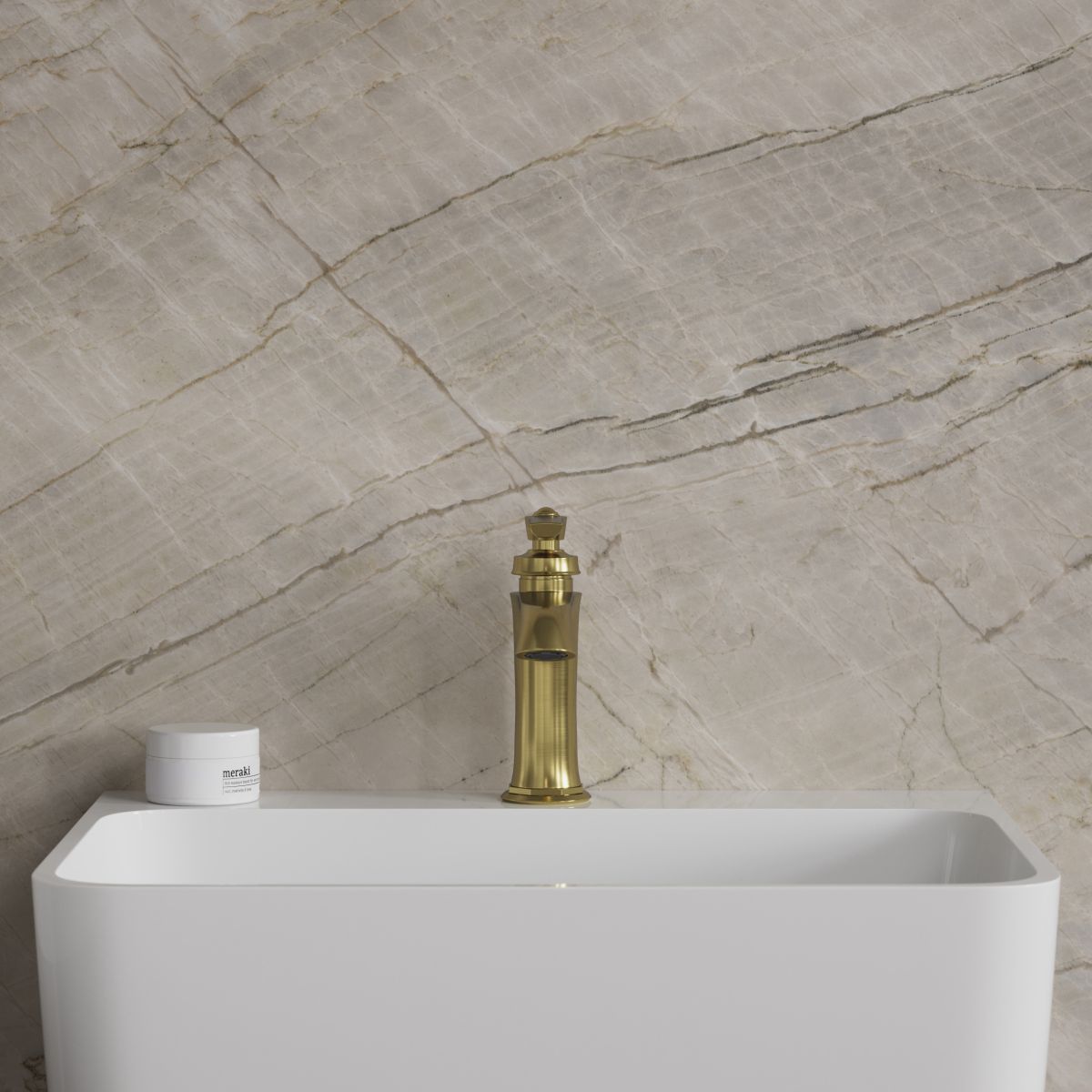 Das gebürstete Messing ist eine edle Oberfläche in einem kühlen Goldton mit satinierter, gebürsteter Oberfläche. Die Beschichtung wurde mit fortschrittlicher PVD-Technologie hergestellt.