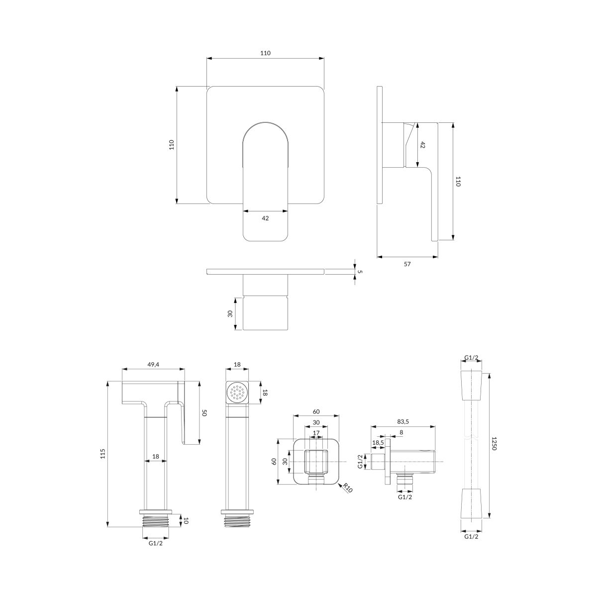 - Inbegriffen: Batterie ohne Schalter, Duschschlauch, Eckanschluss, Duschbrause für das Bidet