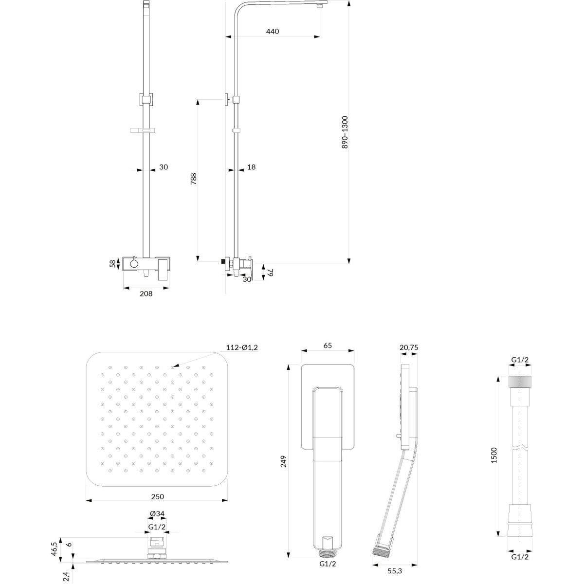 - Edelstahl-Regenduschkopf (WGU225CR), Abmessungen: 25 x 25 cm, Abstand zur Wand: 44 cm