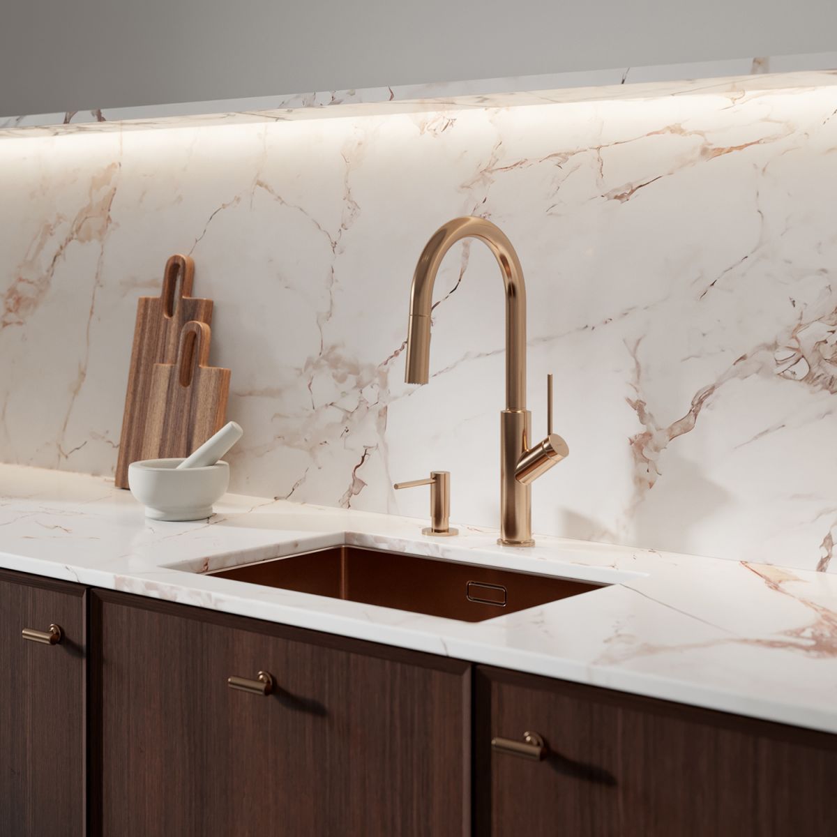 Gebürstetes Kupfer ist eine edle Oberfläche mit einer warmen rotbraunen Farbe und einer satinierten Oberfläche. Die Beschichtung wurde mit fortschrittlicher PVD-Technologie hergestellt.