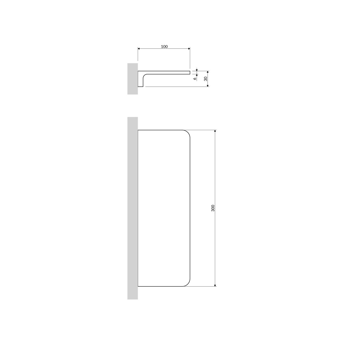 - Breite: 30 cm, Höhe: 3 cm, Abstand zur Wand: 10 cm