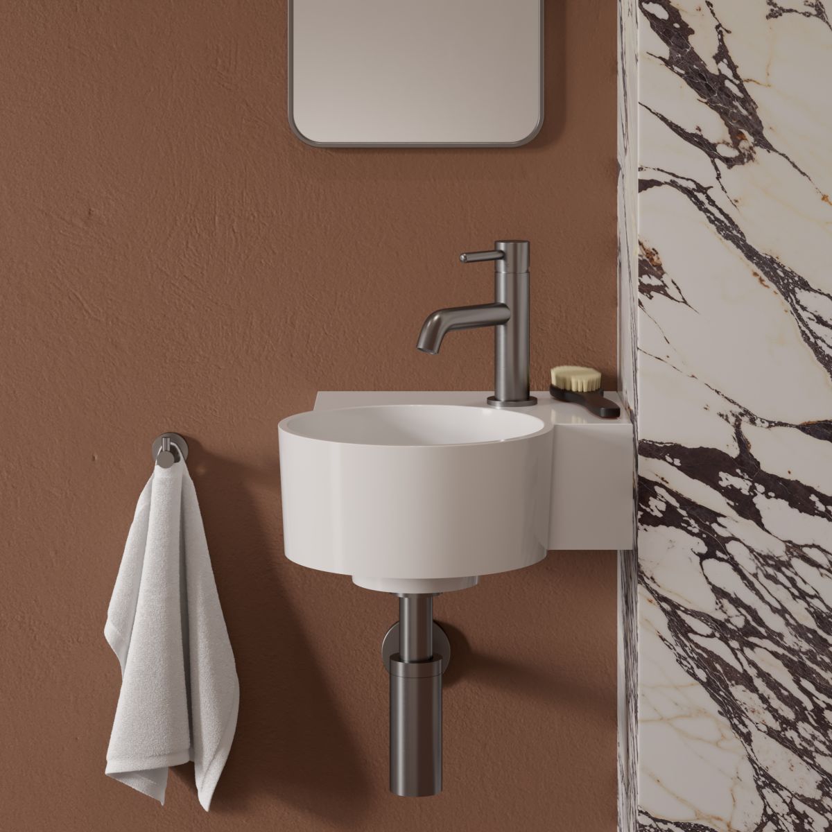 Die sorgfältig ausgearbeitete Form des Waschbeckens mit perfekt verarbeiteten Seitenwänden gewährleistet eine einfache Montage und ein perfektes Aussehen in jeder Ausführung. An der Wand oder in einer Ecke aufgehängt, besticht es durch seine moderne Leichtigkeit, und auf einer Arbeitsplatte platziert, unterstreicht es die Ausdruckskraft und den einzigartigen Stil des Innenraums. Durch seine kompakten Abmessungen ist es auch für Räume mit begrenzter Fläche die perfekte Wahl.