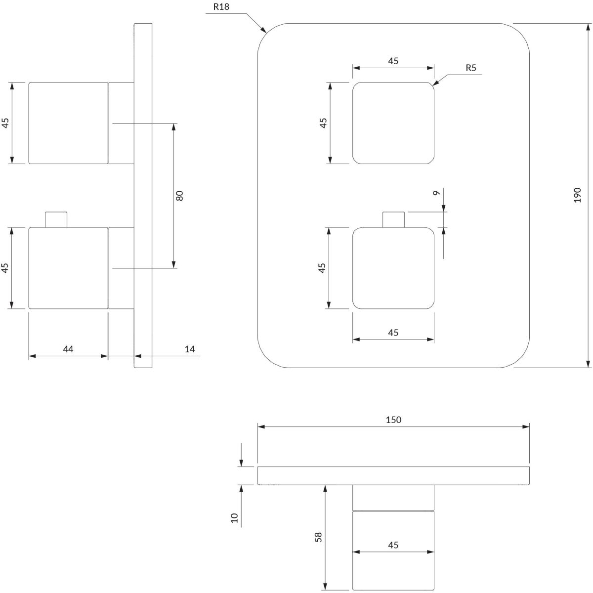 - zwei Eingänge (für Warm- und Kaltwasser): 1/2”, zwei Ausgänge für Mischwasser: 1/2”