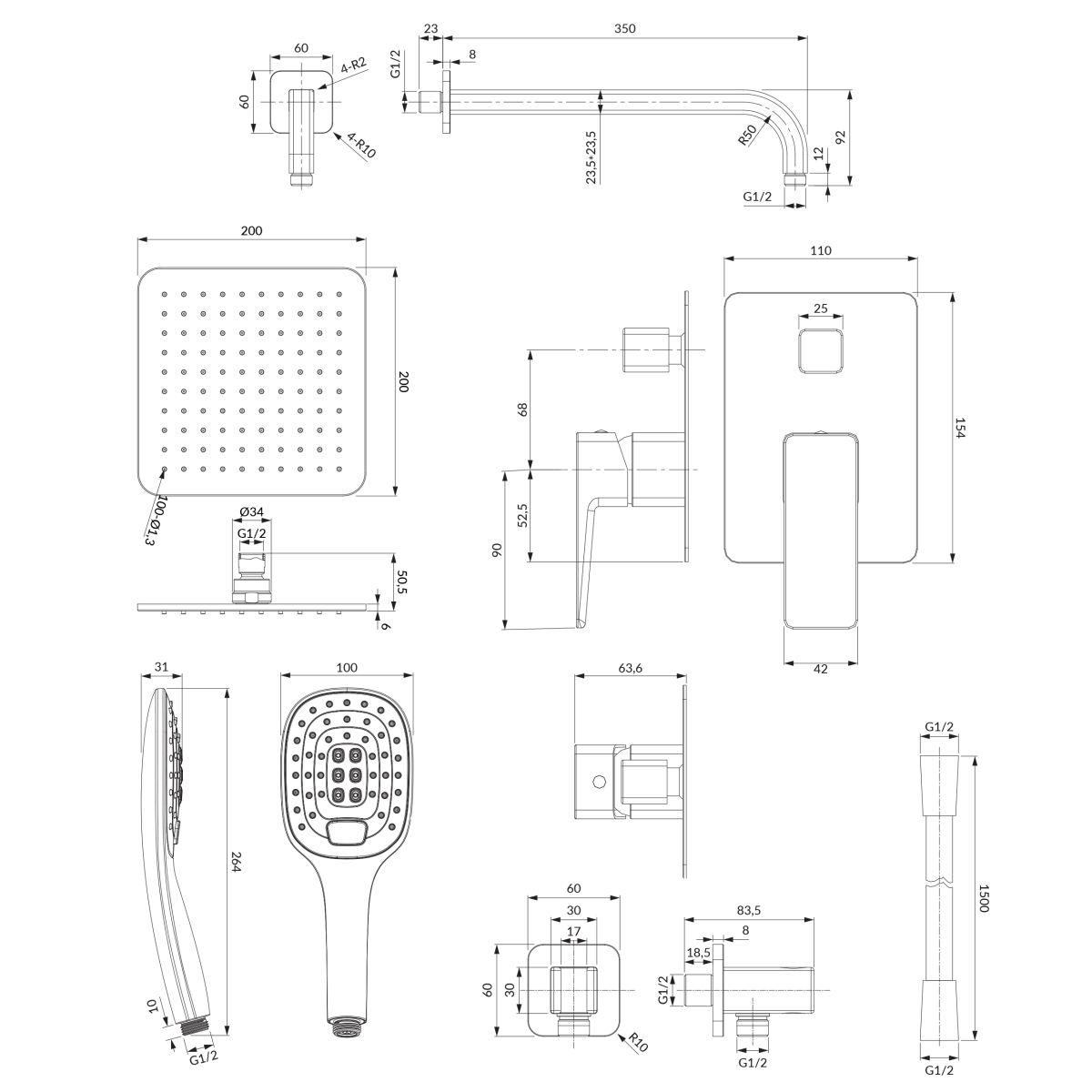 - Inbegriffen: Batterie mit Schalter, Duschkopf, Duschkopf, Duschschlauch, Duscharm, Eckanschluss
