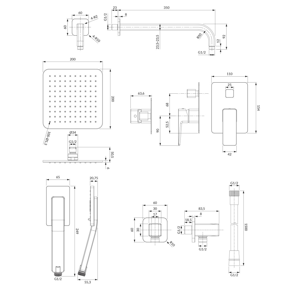 - Inbegriffen: Batterie mit Schalter, Duschkopf, Duschkopf, Duschschlauch, Duscharm, Eckanschluss