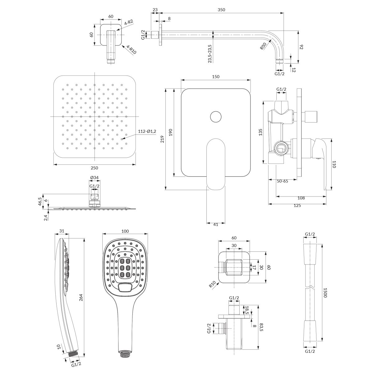 - Inbegriffen: Batterie mit Schalter, Duschkopf, Duschkopf, Duschschlauch, Duschhalter, Eckanschluss
