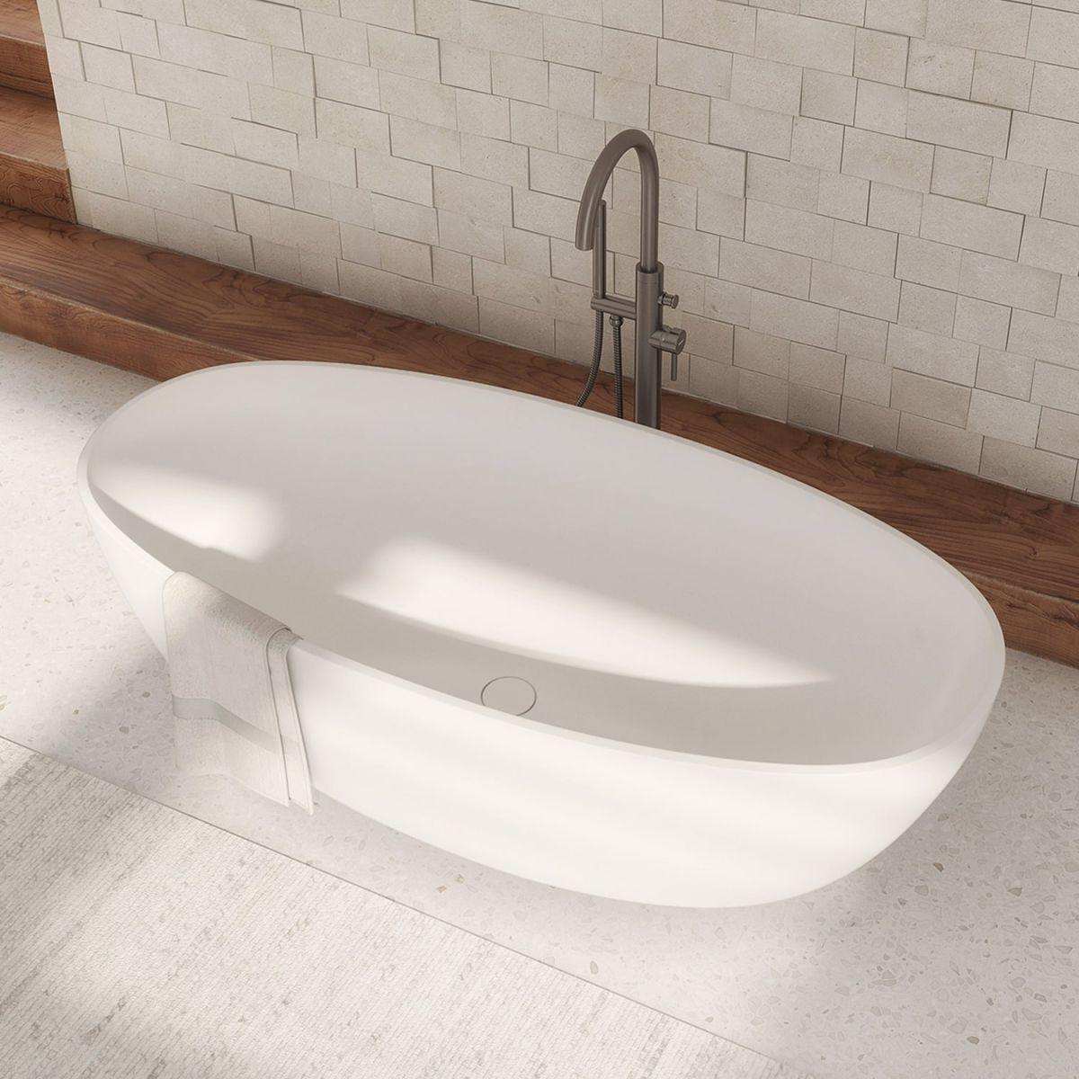 Die freistehende Badewanne aus der OMNIRES SHELL M+ Kollektion zeichnet sich durch eine moderne elliptische Form aus, die sich mit einer weichen Linie zur Basis hin verjüngt. Die minimalistische Form wirkt leicht und gleichzeitig solide und erzeugt den Effekt eines aus Fels gehauenen Monolithen. Das Innenprofil wurde so gestaltet, dass es Komfort beim Baden gewährleistet. Die Form ist mit soliden, präzise gefertigten 2 cm dicken Kanten versehen. Die Badewanne zeichnet sich durch eine niedrige Einbauhöhe aus, was den Komfort beim selbstständigen Ein- und Aussteigen oder beim Baden von Kindern erhöht. Sie verfügt über benutzerfreundliche Lösungen wie einen Siphon mit passendem Klick-Klack-Stopfen im Lieferumfang oder einen zentral angeordneten Abfluss, sodass zwei Personen bequem in der Badewanne entspannen können.