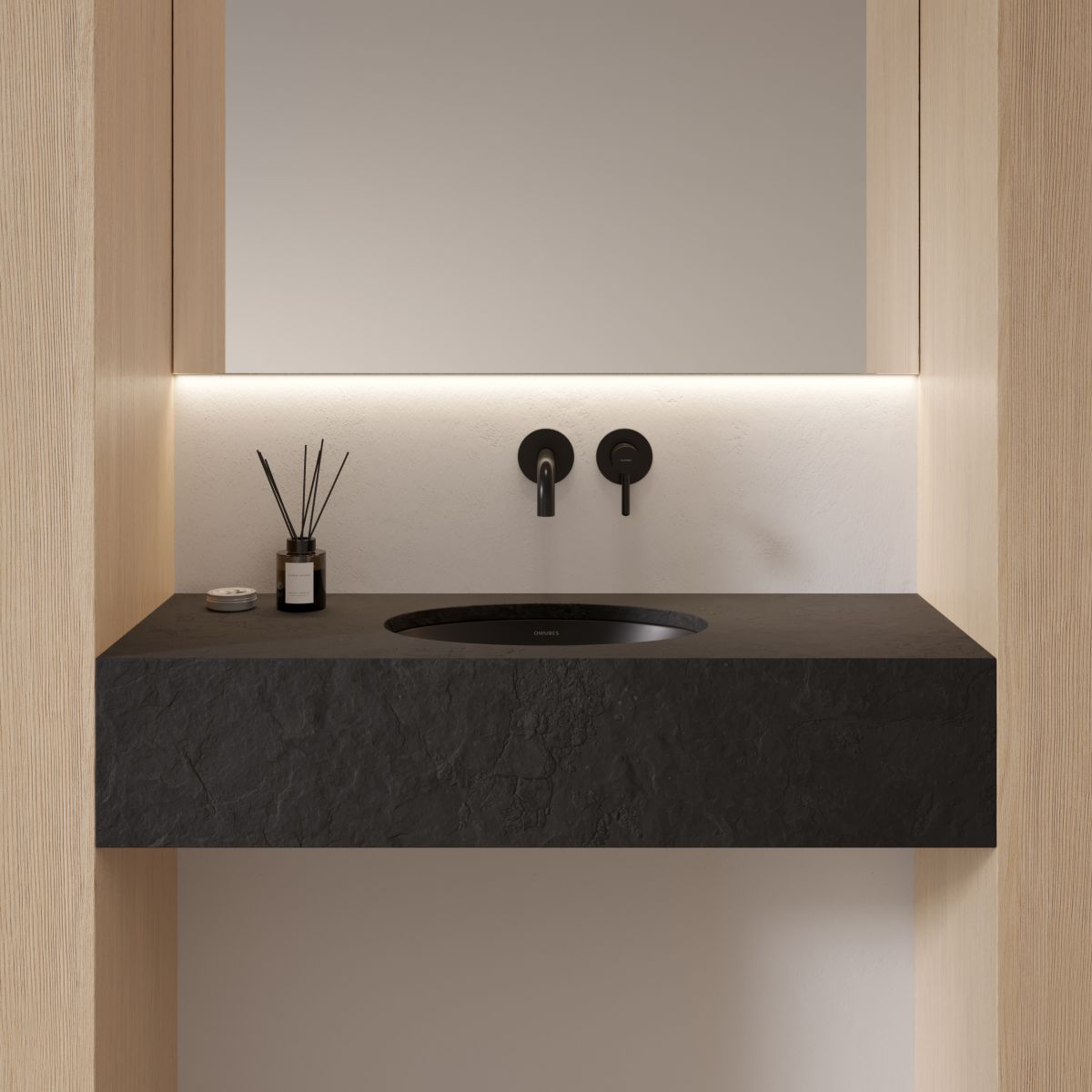 SHELL in der Farbe Black Lava (RAL9005) ist ein Waschbecken in einem ausdrucksstarken Schwarzton mit einer samtigen, matten Oberfläche.