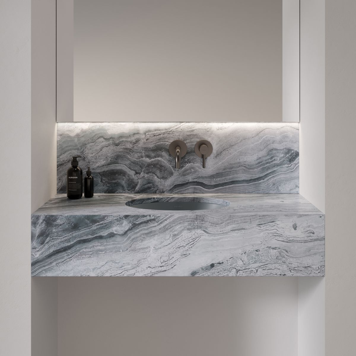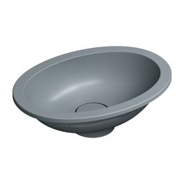 SHELL in der Farbe Ash Grey (RAL7022) ist ein Waschbecken in einem eleganten warmen Grauton mit einer samtigen, matten Oberfläche.