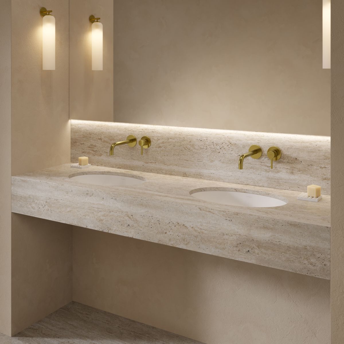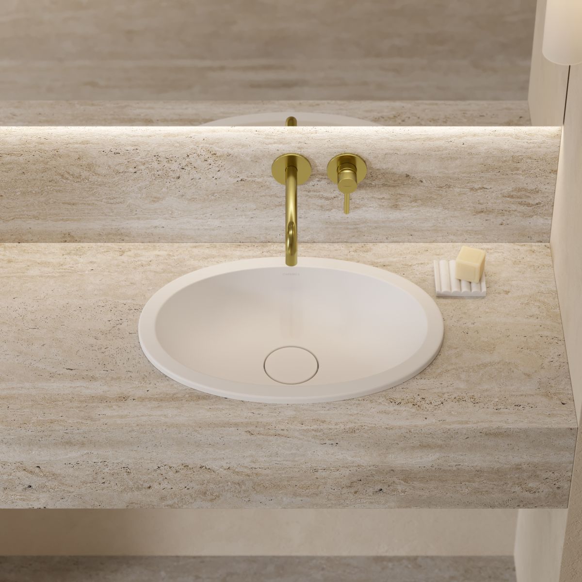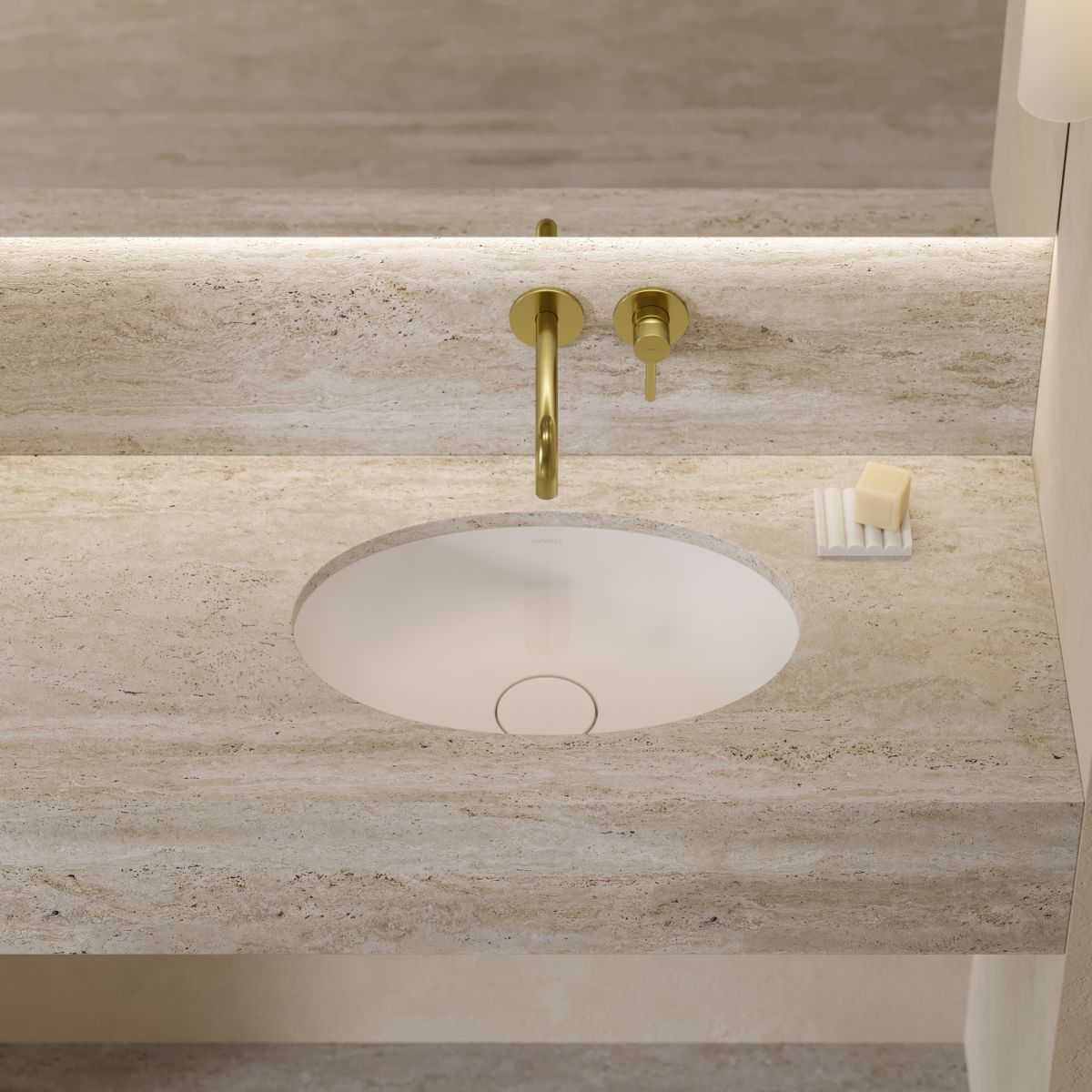 Das Unterbauwaschbecken aus der OMNIRES SHELL M+ Kollektion zeichnet sich durch eine moderne, elliptische Form aus, die sich mit einer weichen Linie zur Basis hin verjüngt. Seine optimalen Abmessungen eignen sich sowohl für Badezimmer mit einem Einzel- als auch mit einem Doppelwaschbecken. Die präzise gestaltete Konstruktion des Randes ermöglicht die Montage des Waschbeckens unter der Arbeitsplatte, wodurch eine einheitliche, zusammenhängende Oberfläche entsteht. Alternativ kann das Waschbecken auch in die Arbeitsplatte eingelassen werden, sodass nur ein minimalistischer Rand auf der Oberfläche sichtbar bleibt. Beide Montagemöglichkeiten erleichtern nicht nur die tägliche Pflege, sondern nutzen auch den Platz optimal aus, sodass das Waschbecken die ideale Wahl für moderne und minimalistische Innenräume ist.