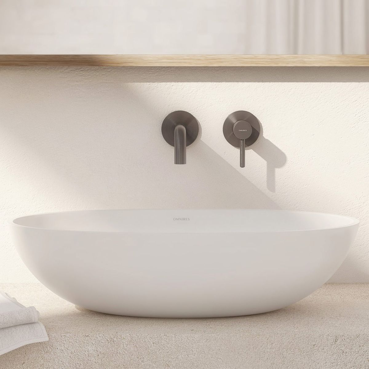 Das Aufsatzwaschbecken aus der OMNIRES SHELL M+ Kollektion zeichnet sich durch eine moderne elliptische Form aus, die sich mit einer weichen Linie zur Basis hin verjüngt. Die minimalistische Form wirkt leicht und gleichzeitig solide und erzeugt den Effekt eines aus Fels gehauenen Monolithen. Im Inneren des Waschbeckens verdeckt eine passende Abdeckung diskret den Abfluss, ohne die harmonisch geformte Silhouette zu stören.