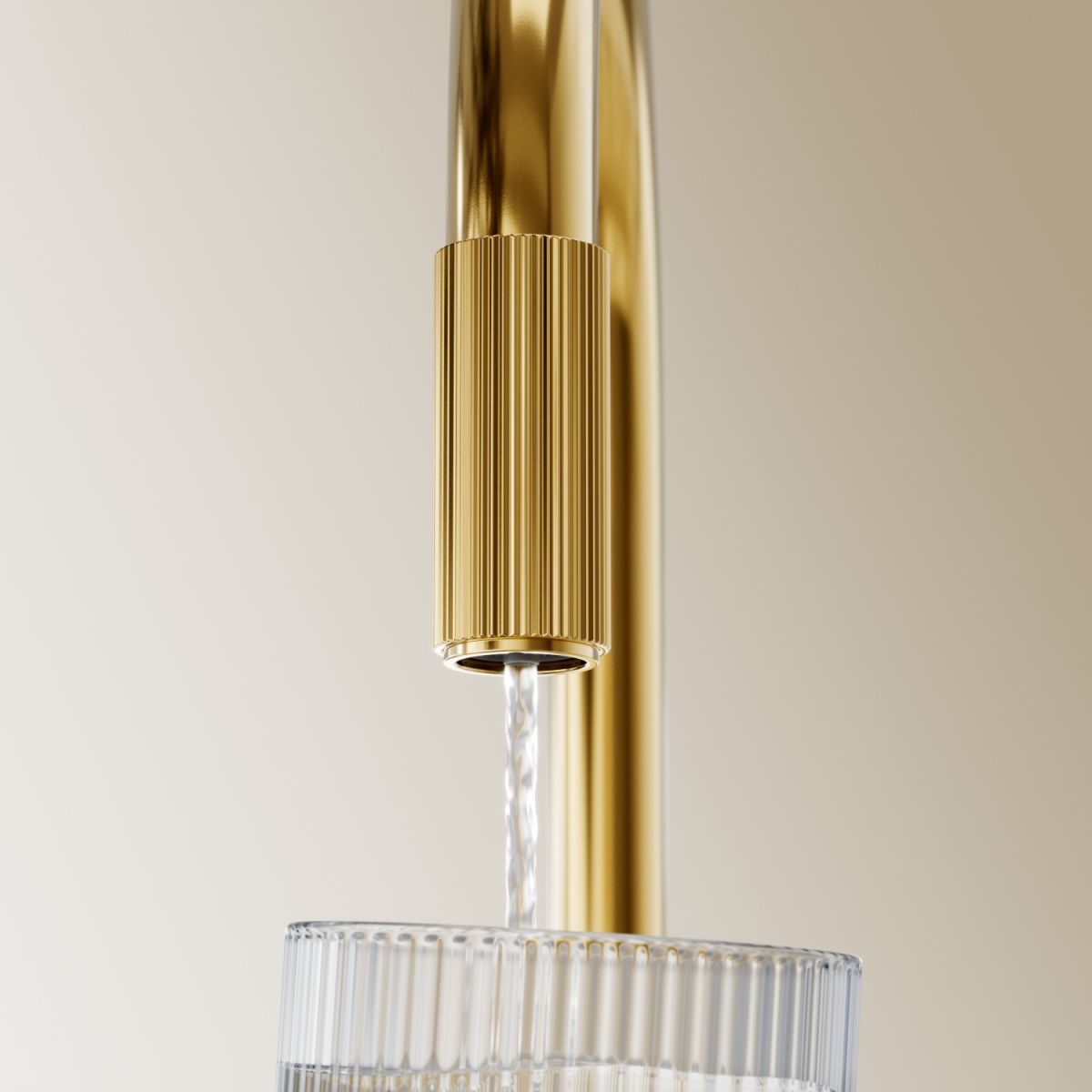 Die Küchenarmatur OMNIRES SWITCH verbindet minimalistisches, auf ausgewogenen Proportionen basierendes Design mit praktischer Funktionalität und liefert sowohl normales als auch gefiltertes Wasser. Die markanten, präzise geriffelten Details ermöglichen eine intuitive Bedienung und zeigen zwei unabhängige Wasserentnahmestellen an: normales Wasser am Mischventil und gefiltertes Wasser am Ende des Auslaufs – drehen Sie einfach den Ring am Auslauf, um ein Glas mit einem schnellen Strahl Trinkwasser von höchster Geschmacksqualität zu füllen.