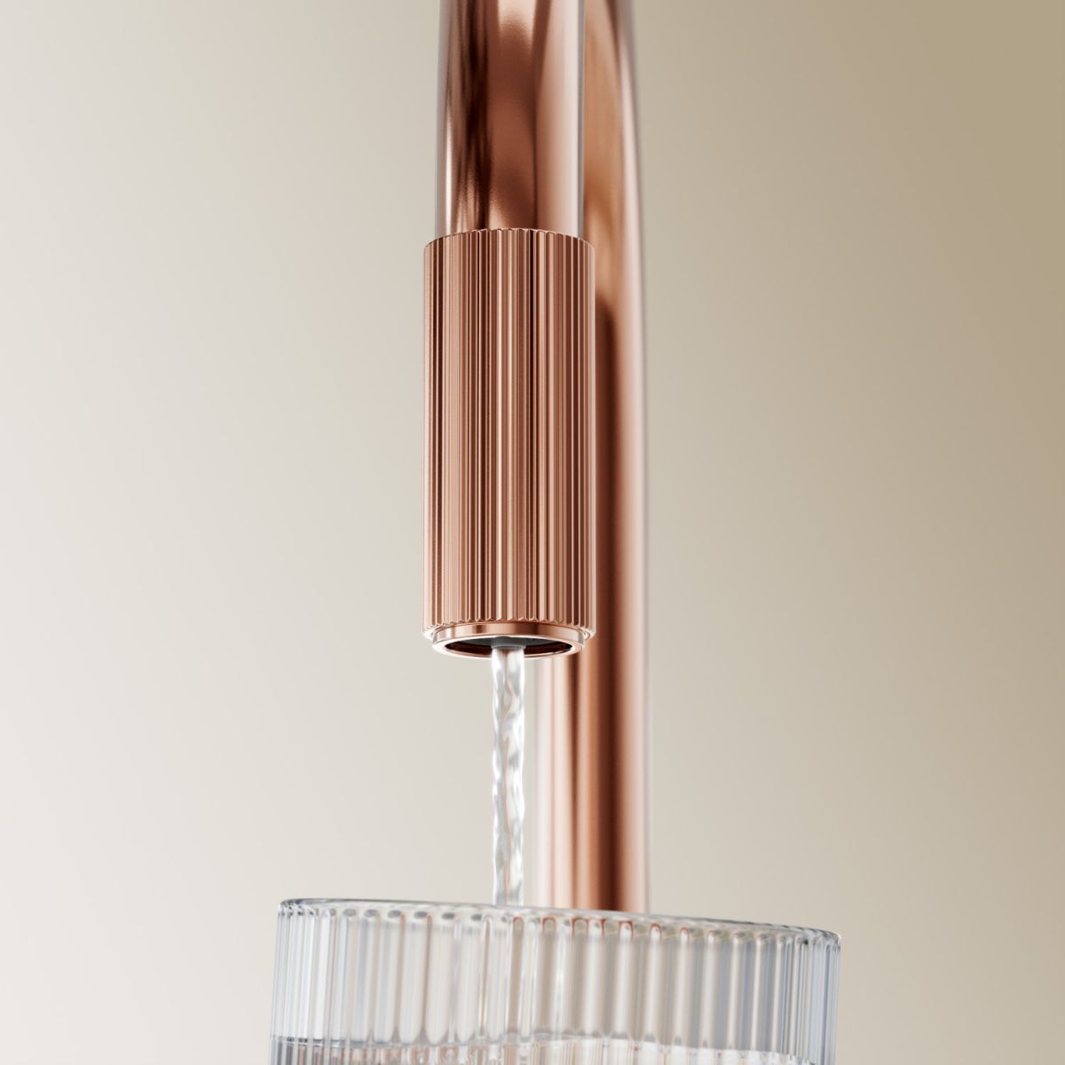 Die Küchenarmatur OMNIRES SWITCH verbindet minimalistisches, auf ausgewogenen Proportionen basierendes Design mit praktischer Funktionalität und liefert sowohl normales als auch gefiltertes Wasser. Ausdrucksstarke, präzise geriffelte Details ermöglichen eine intuitive Bedienung und zeigen zwei unabhängige Wasserentnahmestellen an: normales Wasser am Mischventil und gefiltertes Wasser am Ende des Auslaufs – drehen Sie einfach den Ring am Auslauf, um ein Glas mit einem schnellen Strahl Trinkwasser von höchster Geschmacksqualität zu füllen.