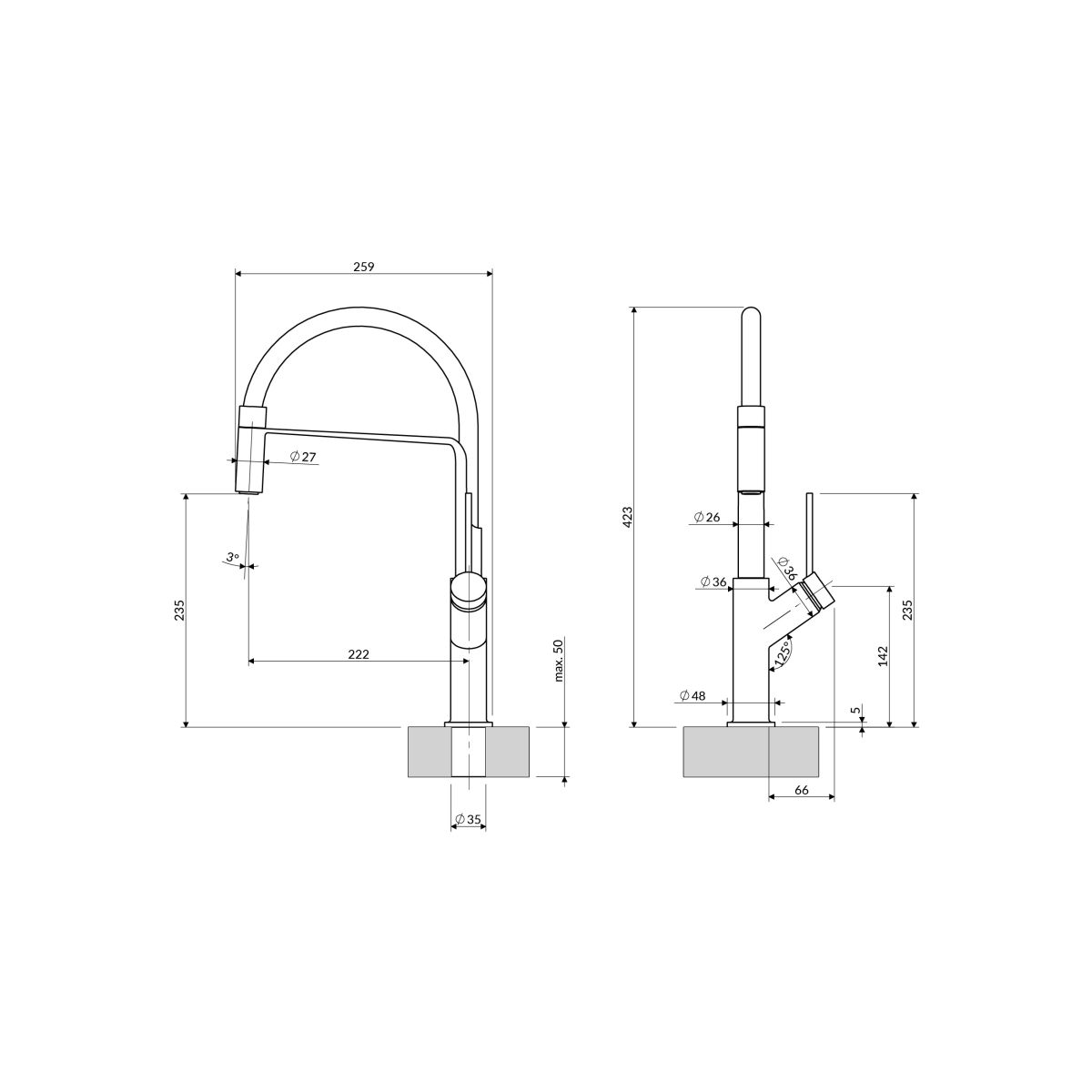 - Höhe des Wasserauslaufs: 23,5 cm