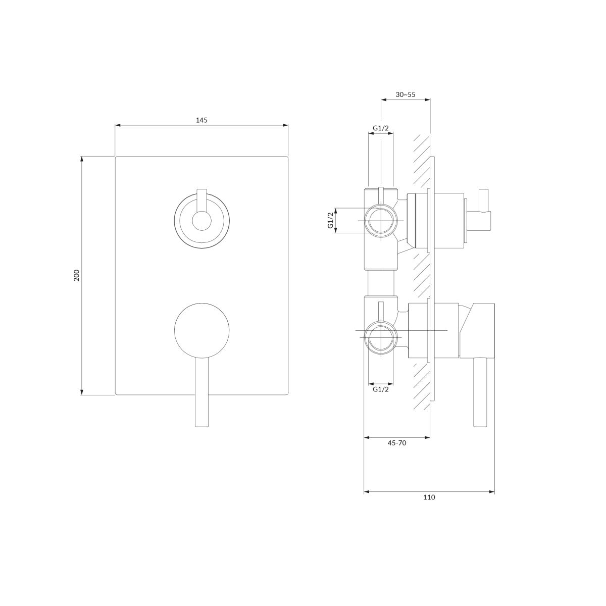 - zwei Eingänge (für Warm- und Kaltwasser): 1/2”, drei Ausgänge für Mischwasser: 1/2”