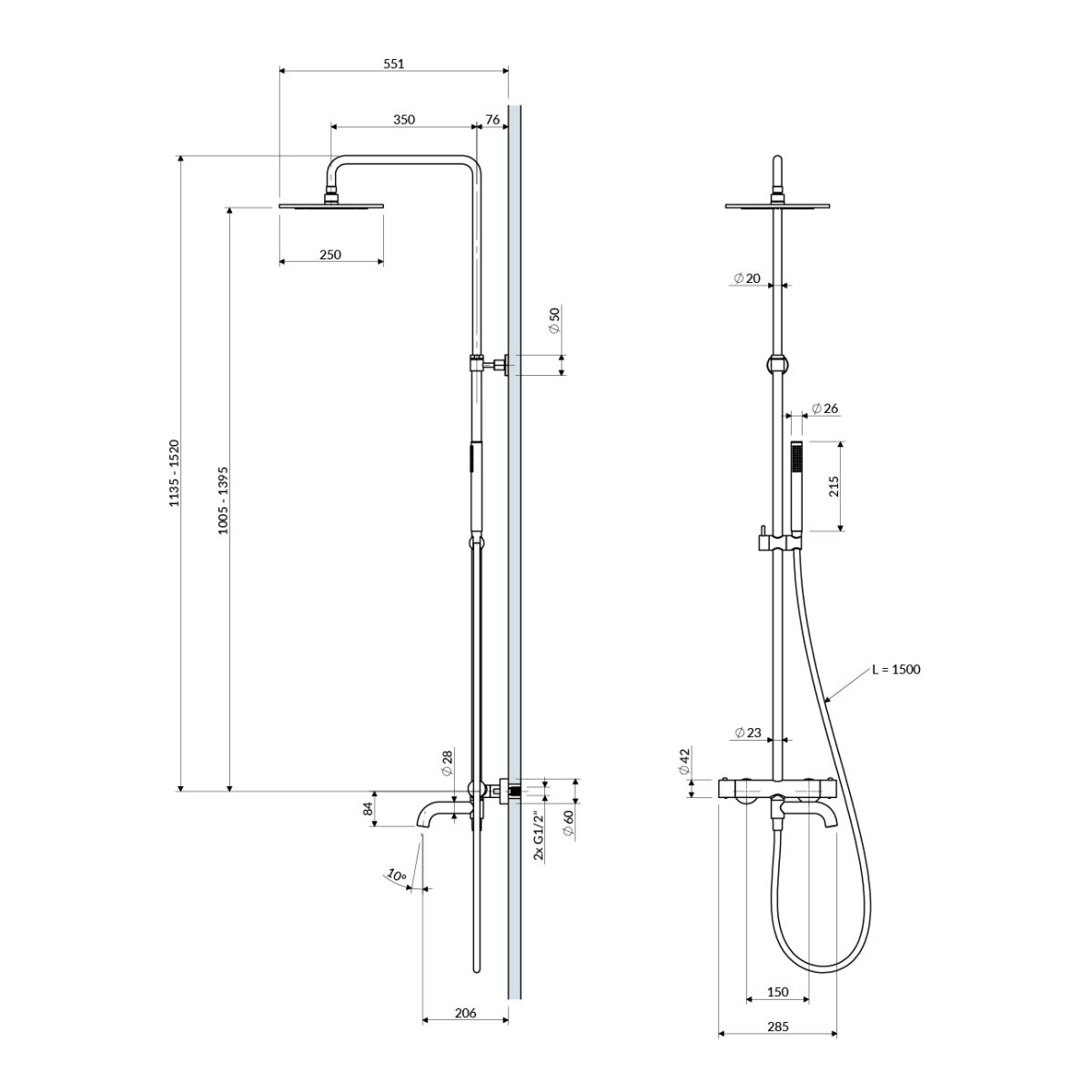 - Inbegriffen: Batterie mit Schalter, Duschkopf, Wannenverkleidung, Duschkopf, Duschschlauch, Duschstange