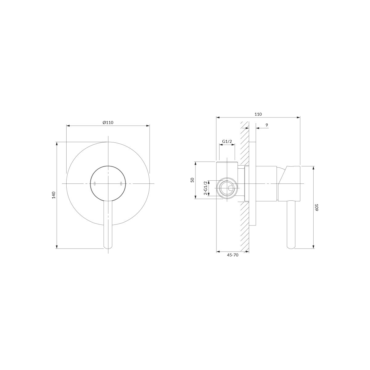 - zwei Eingänge (für Warm- und Kaltwasser): 1/2”, ein Ausgang für Mischwasser: 1/2”