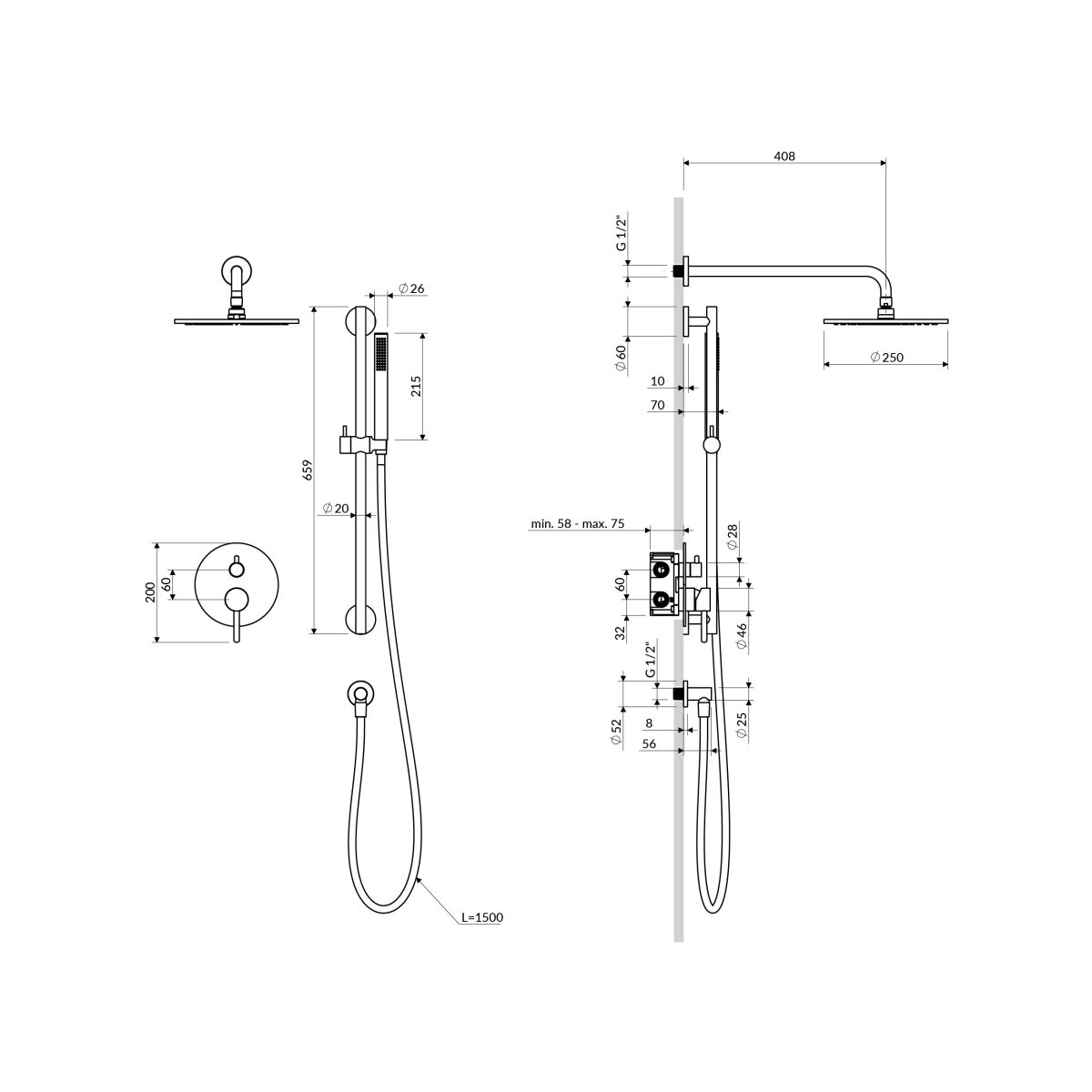 Lieferumfang: Batterie mit Schalter, Duschkopf, Duschkopf, Duschschlauch, Duschstange, Duscharm, Eckanschluss