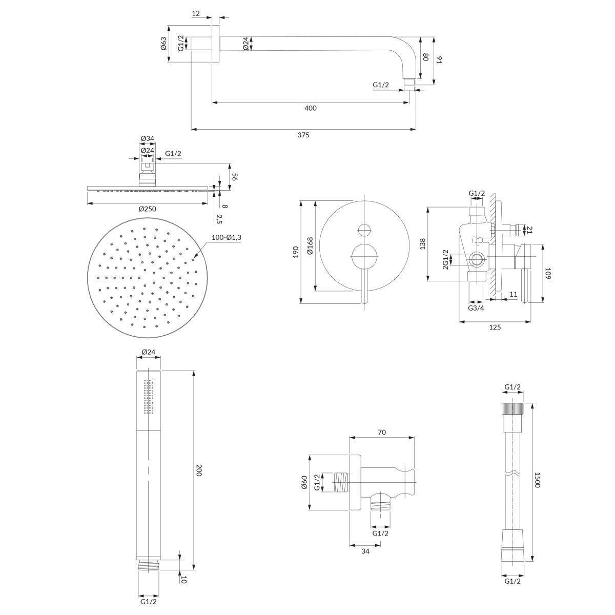 - Inbegriffen: Batterie mit Schalter, Duschkopf, Duschkopf, Duschschlauch, Duscharm, Eckanschluss