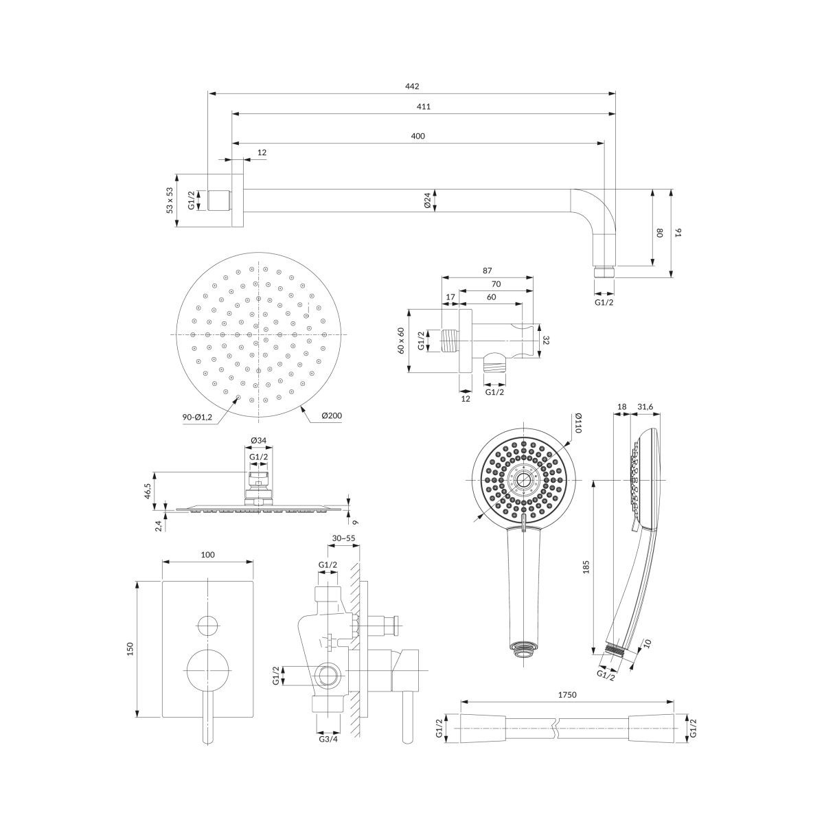 - Inbegriffen: Batterie mit Schalter, Duschkopf, Duschkopf, Duschschlauch, Eckanschluss
