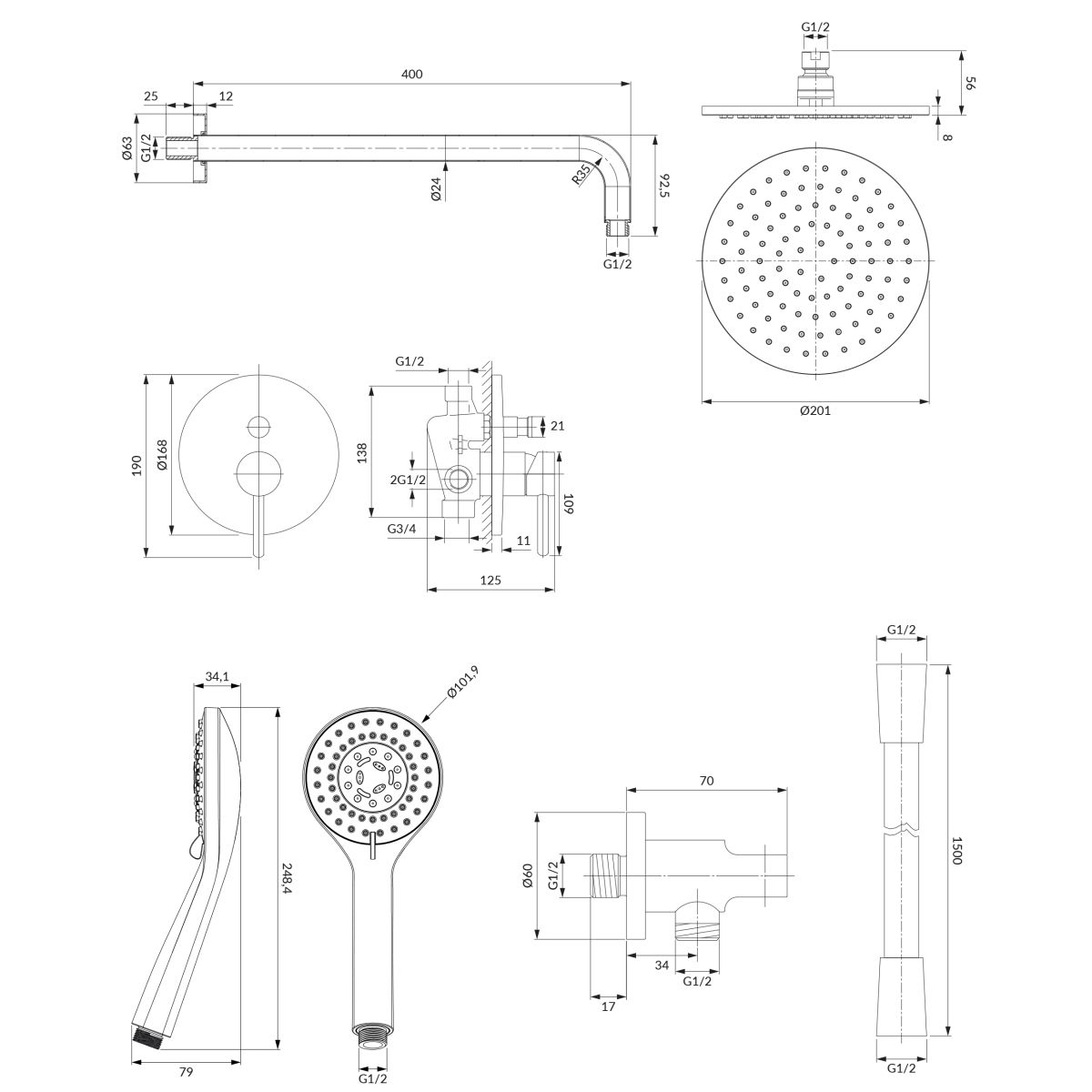 - Inbegriffen: Batterie mit Schalter, Duschkopf, Duschkopf, Duschschlauch, Duschhalter, Eckanschluss