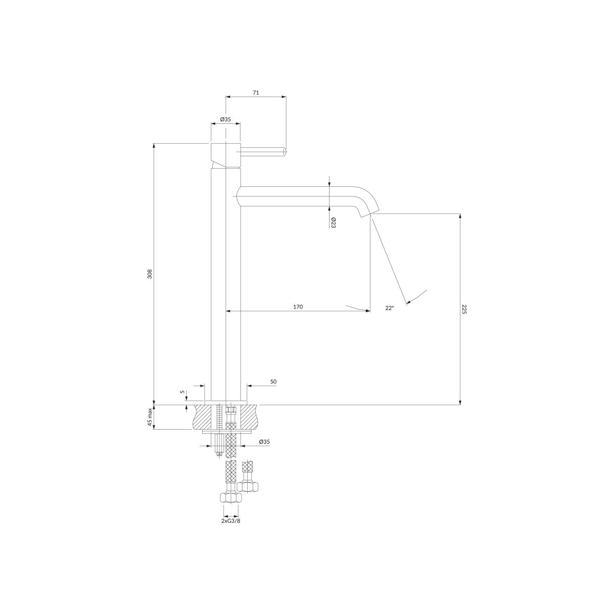 - Höhe des Wasserauslaufs: 22,5 cm