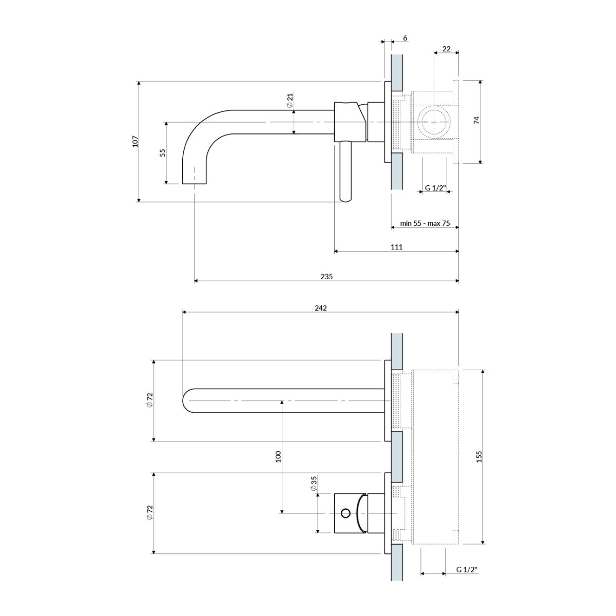 - Auslaufweite von der Fliesenoberfläche: 19-21,5 cm (abhängig von der Einbautiefe der Armatur in der Wand)