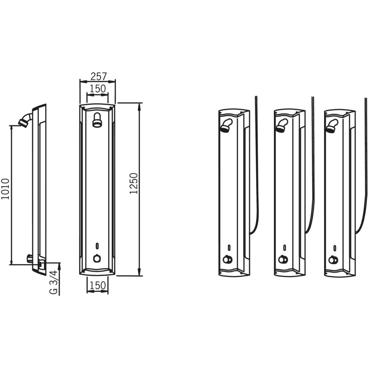 - Das Duschpaneel ist mit Siebfiltern, Rückschlagventilen, einem Durchflussregler und einem Stromkabel zum Transformator (10 m) ausgestattet