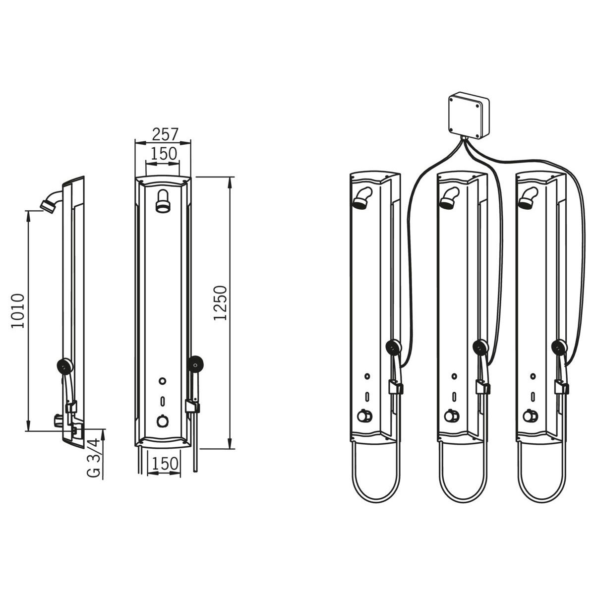 - 2 Duschköpfe: Der obere ist ein integraler Bestandteil des Panels, der untere befindet sich in einem abnehmbaren Duschgriff