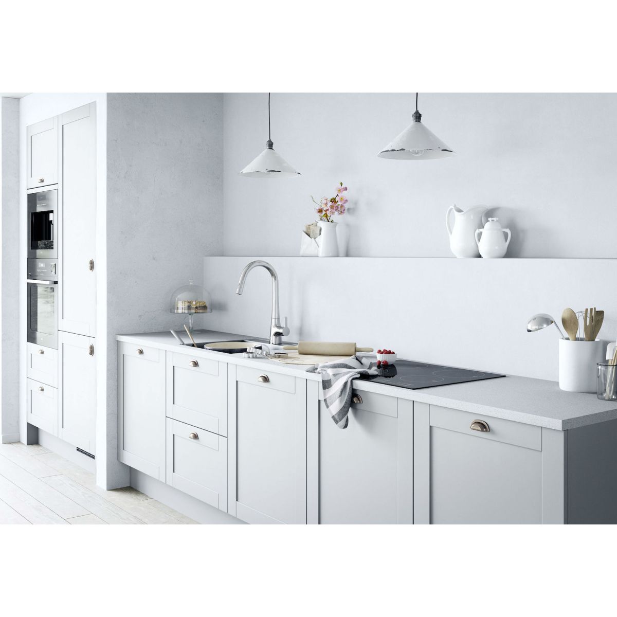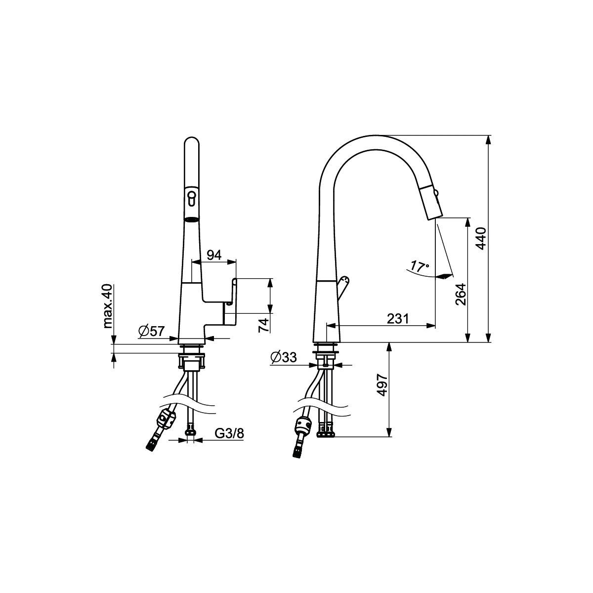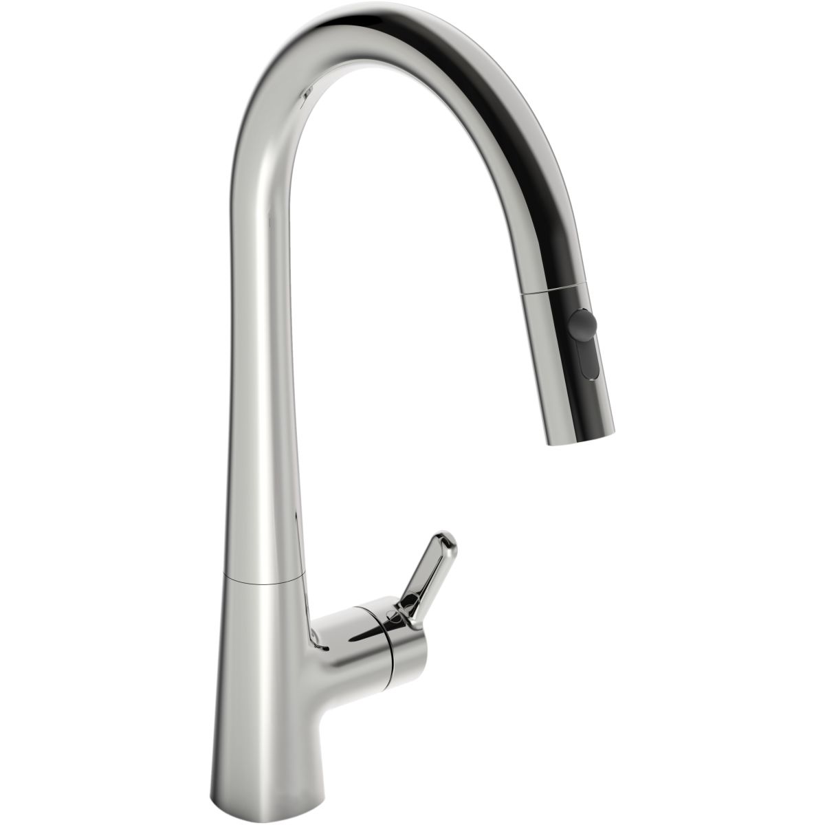 Küchenarmatur mit schwenkbarem, ausziehbarem Auslauf und Strahlregler. Die Reichweite des ausziehbaren Auslaufs kann eingestellt werden. Der Schwenkwinkel des Auslaufs ist werkseitig auf 120° eingestellt (kann auf 60°-0° begrenzt werden). Verfügt außerdem über eine integrierte Funktion zur Begrenzung des Wasserdurchflusses und der Wassertemperatur.