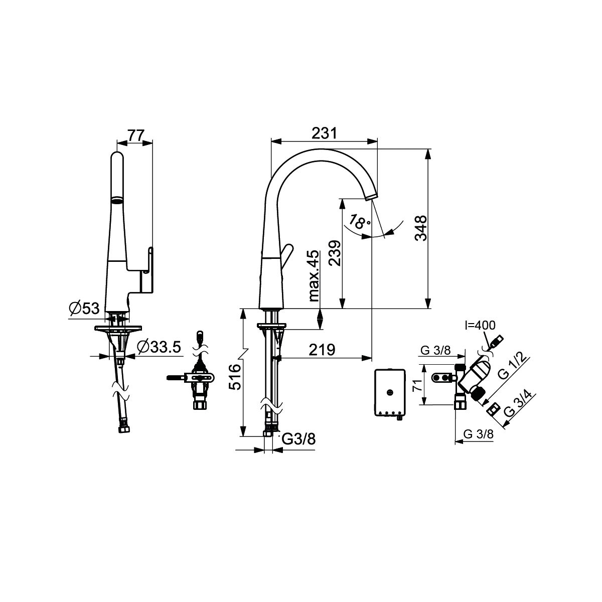 - Küchenarmatur mit intelligentem Ventil für Geschirrspüler und hohem Schwenkauslauf