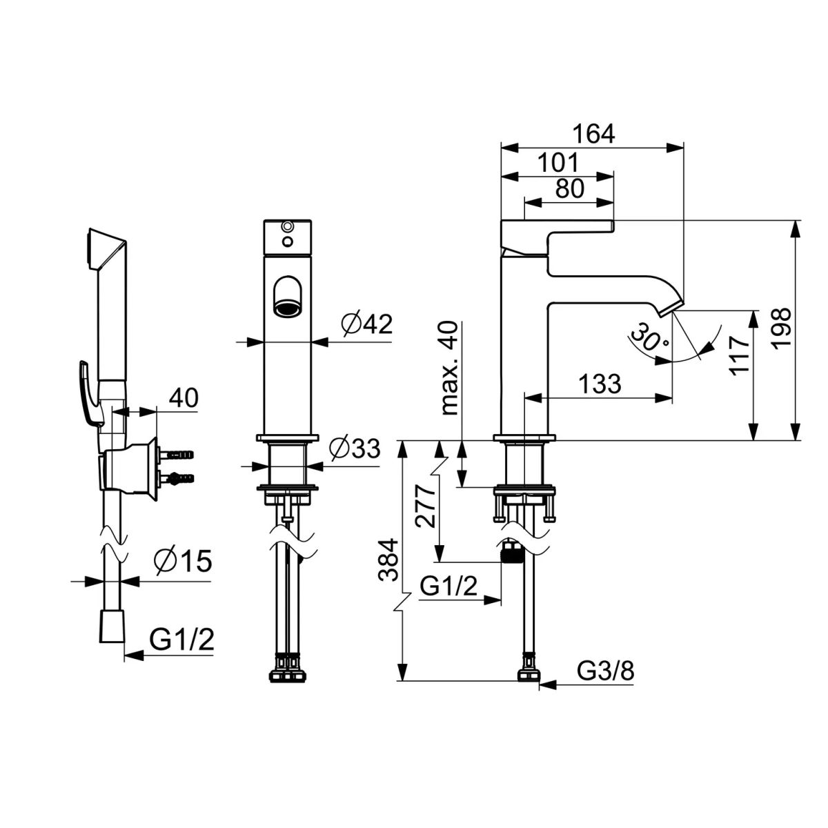 - Mechanische Teile: Keramikkopf ø 30 mm zur Einstellung von Durchfluss und Temperatur