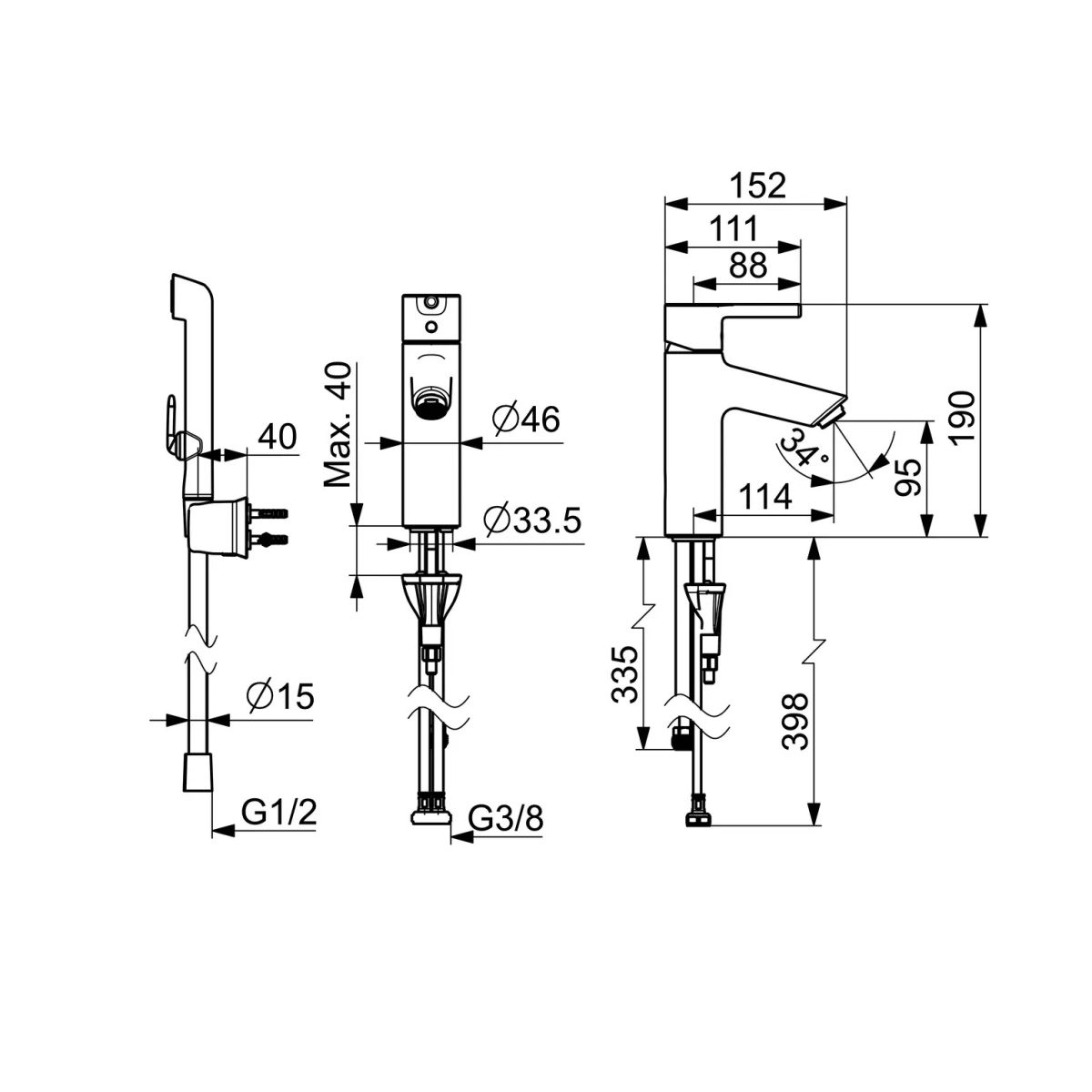 - Hebel / Griffart: Einzelhebel/Griff, Hebel mit Stange, Symbole für warm/kalt