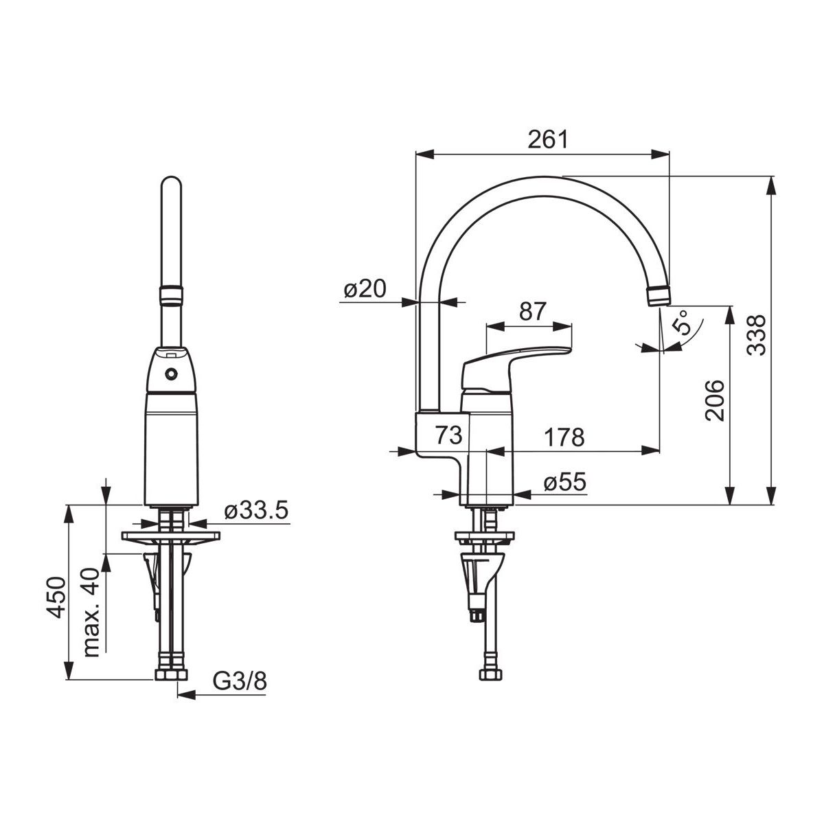 - Gesamthöhe der Armatur: 338 mm