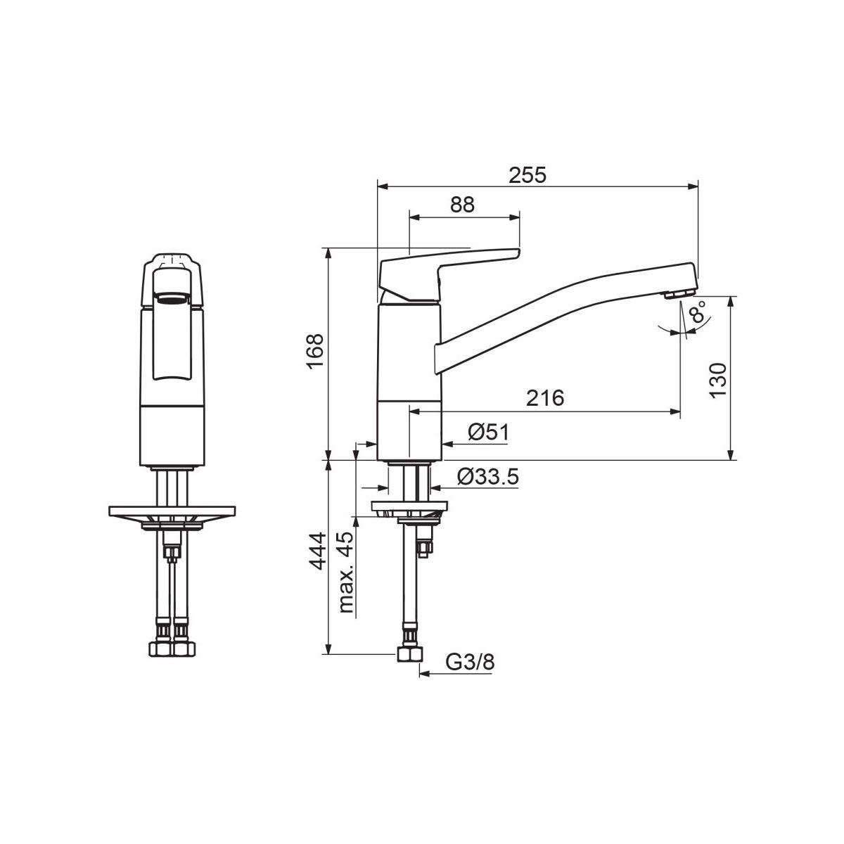 - Der Schwenkwinkel des Auslaufs ist werkseitig auf 120° eingestellt (kann auf 60° arretiert werden)