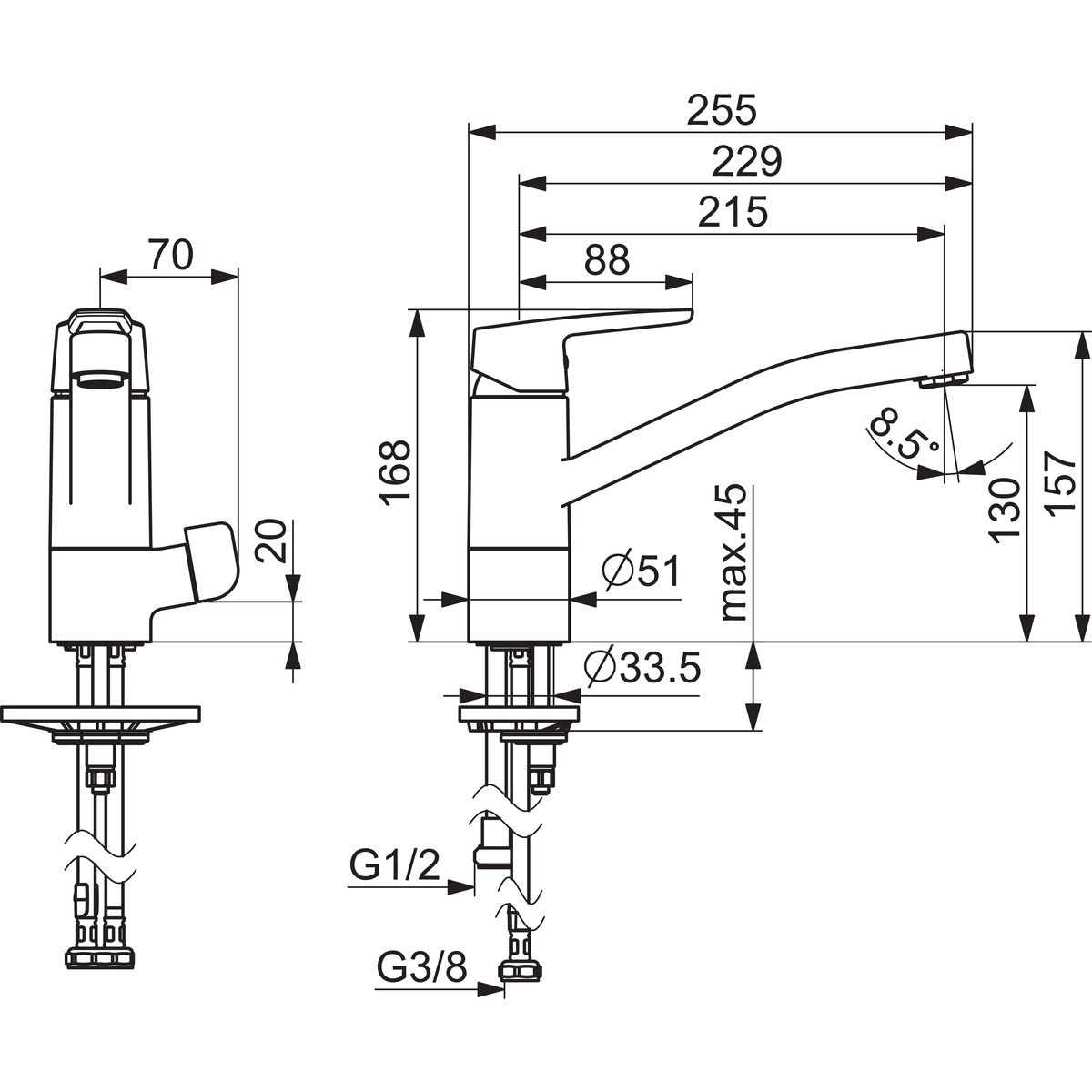 - Schwenkbereich des Auslaufs: 120° (80° / 40°)