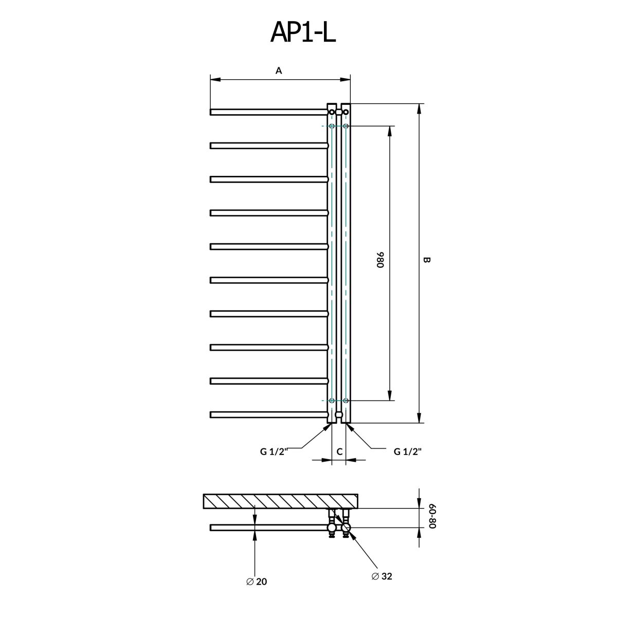 Verfügbare Größen und Varianten: Der Heizkörper Apollo ist in zwei praktischen Höhen sowie in einer links- und einer rechtsseitigen Version erhältlich, sodass Sie ihn leicht an die Gestaltung Ihres Badezimmers anpassen können. Der Heizkörper verfügt über einen zentralen Anschluss.
