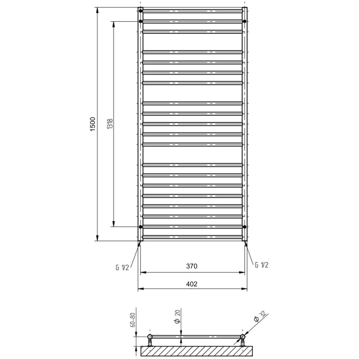 - Durchmesser der vertikalen Kollektoren: ø 32 mm