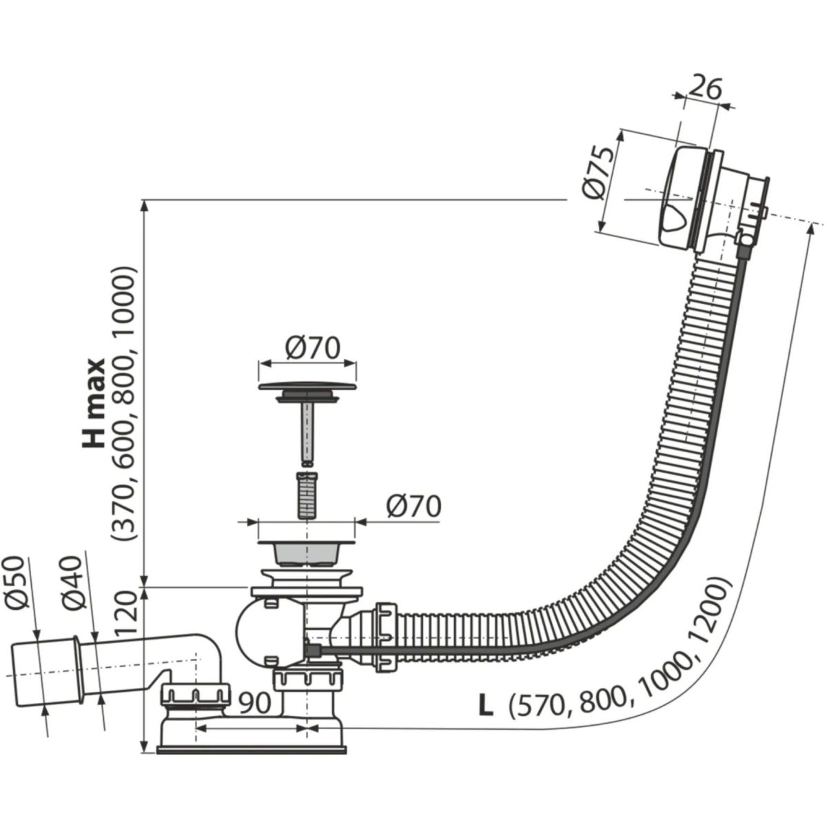 - Länge des Badewannensiphons 80 cm