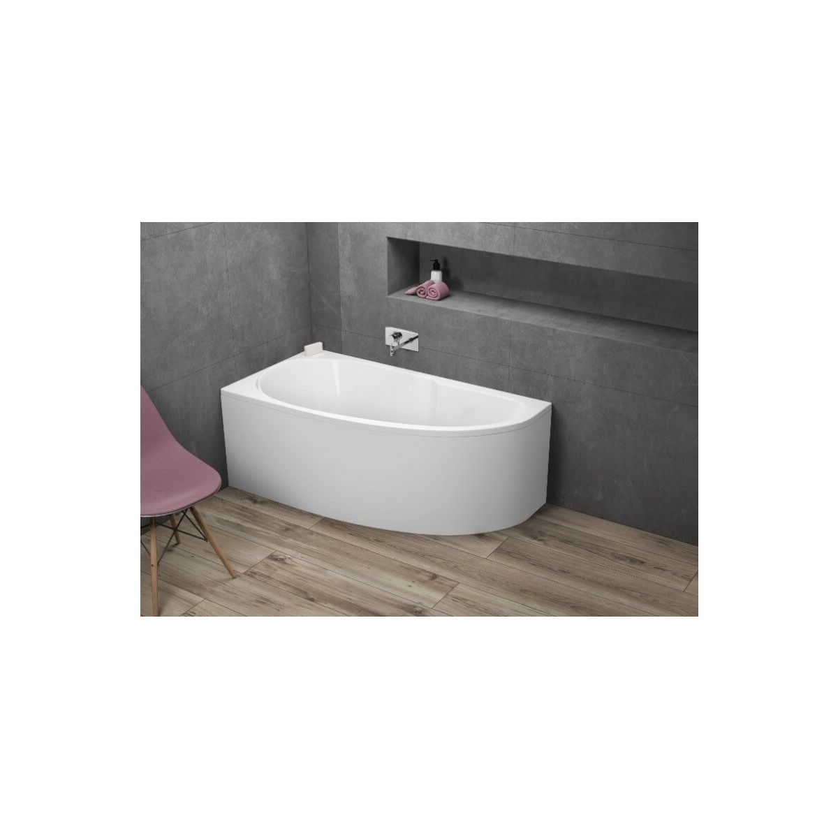Die asymmetrische Eckbadewanne Miki vereint Ästhetik und Funktionalität. Die glatten, angenehm anzufassenden Wände dieser Acrylbadewanne sind speziell geformt, um beim Baden eine bequeme Körperhaltung in dieser asymmetrischen Badewanne zu gewährleisten.