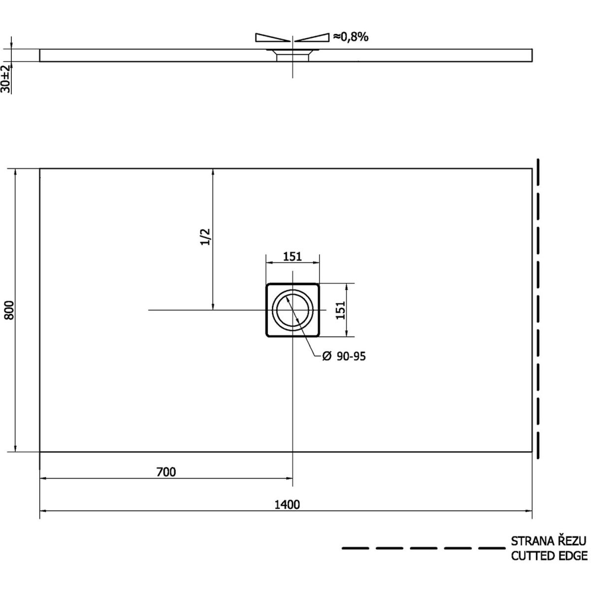 - Eine Seite der Duschwanne in dieser Größe ist zugeschnitten (nicht fertiggestellt – siehe Schema), die Duschwanne sollte so platziert werden, dass die markierte Seite nicht sichtbar ist