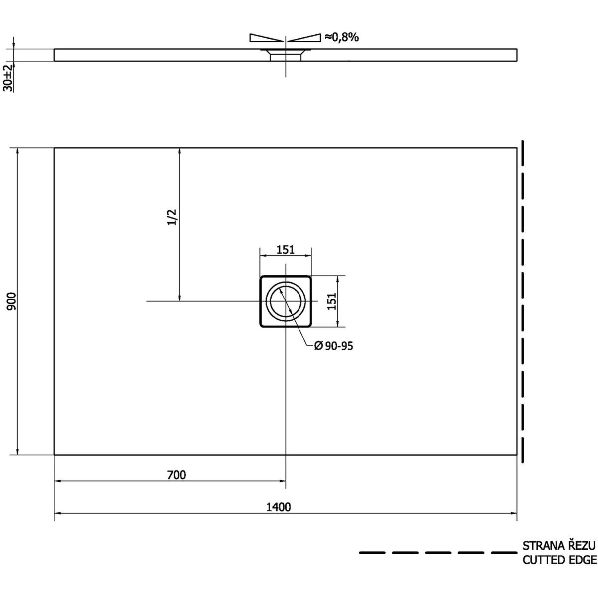 - Eine Seite der Duschwanne in dieser Größe ist zugeschnitten (nicht fertiggestellt – siehe Schema), die Duschwanne sollte so platziert werden, dass die markierte Seite nicht sichtbar ist