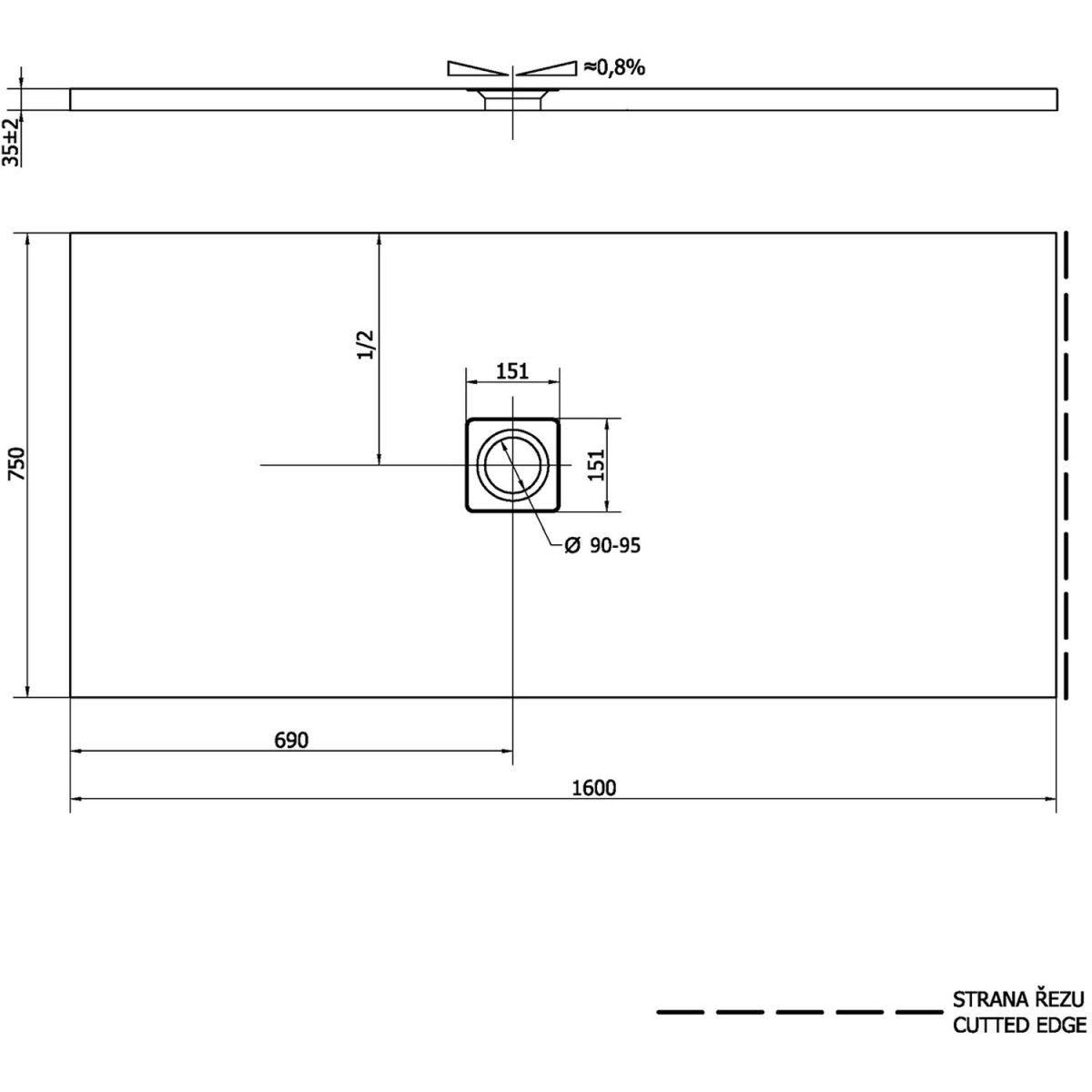 - Eine Seite der Duschwanne in dieser Größe ist zugeschnitten (nicht fertiggestellt – siehe Schema), die Duschwanne sollte so platziert werden, dass die markierte Seite nicht sichtbar ist