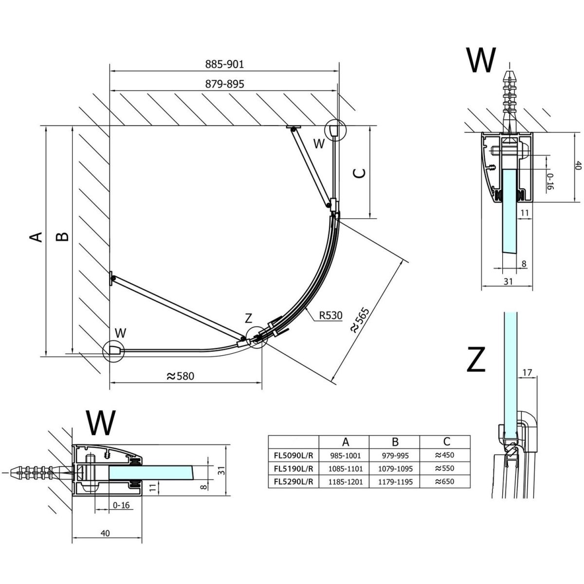 - einfache Installation dank verstellbarem Wandprofil 0-16 mm