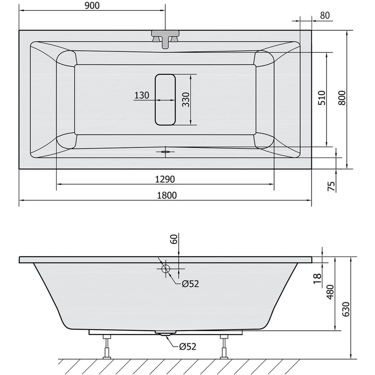 Polysan Marlene Schlanke rechteckige Badewanne 180x80 cm weiß 72034S